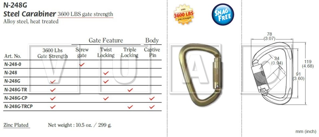 - Mosquetón de acero forjado de 24.0mm (15/16”) de abertura.